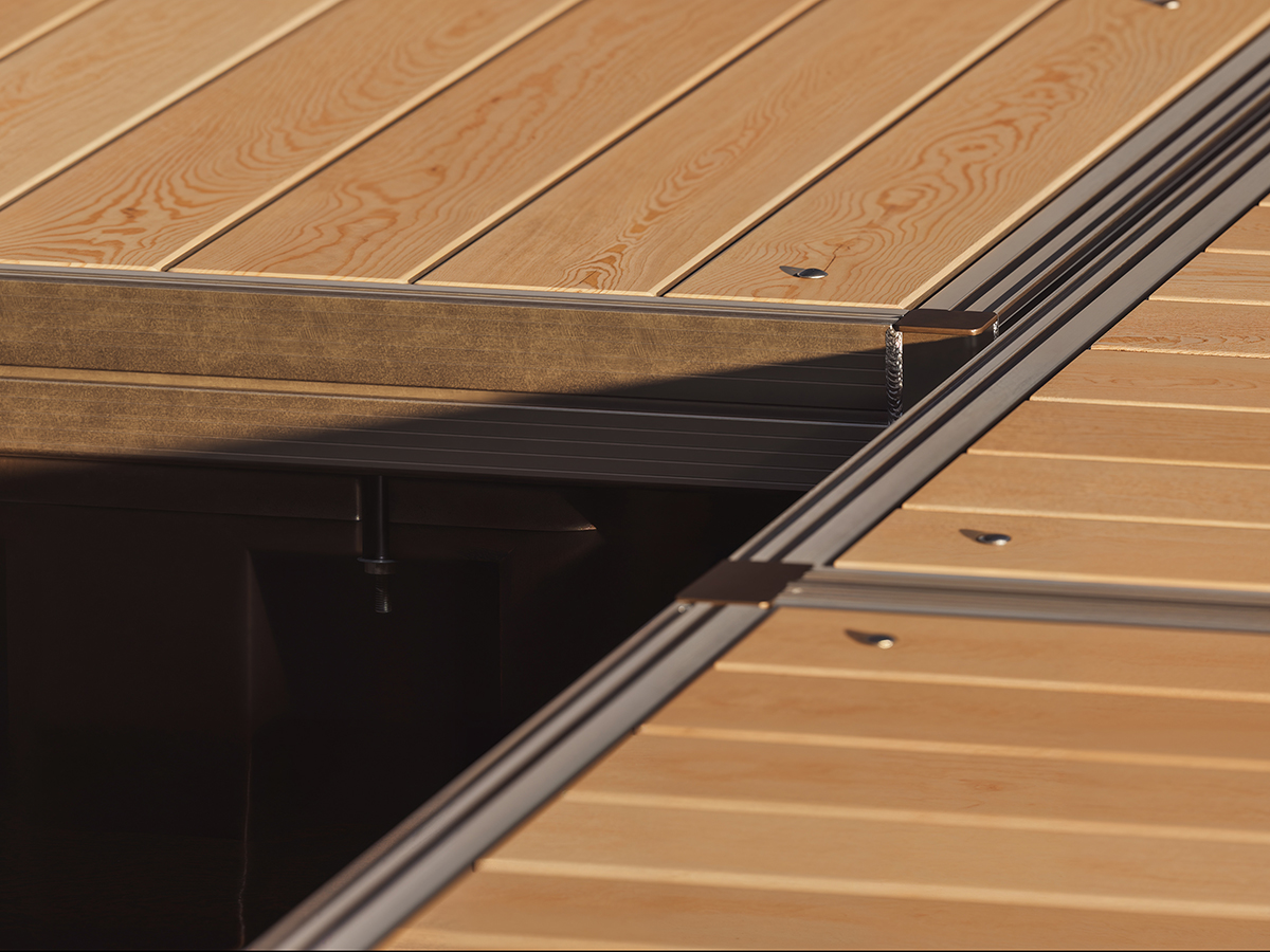Our exclusive X-Wave synthetic decking made of anti-slip plastic is available in grey or beige. It is very lightweight, has a long service life, and requires very little maintenance.